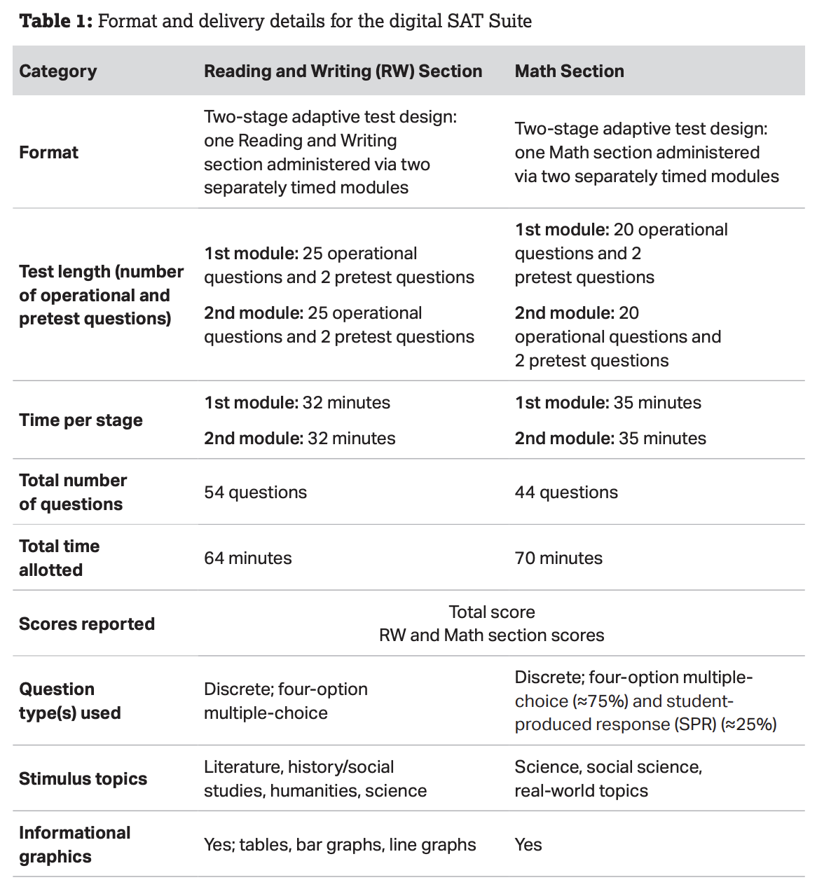 The computer-based adaptive format allows the new Digital SAT to comprise 2 hours and 14 minutes of testing time, about one hour shorter than the current paper and pencil test. The test can maintain the same level of accuracy over a shorter sample of questions because it is adaptive to students’ performance (see next section).